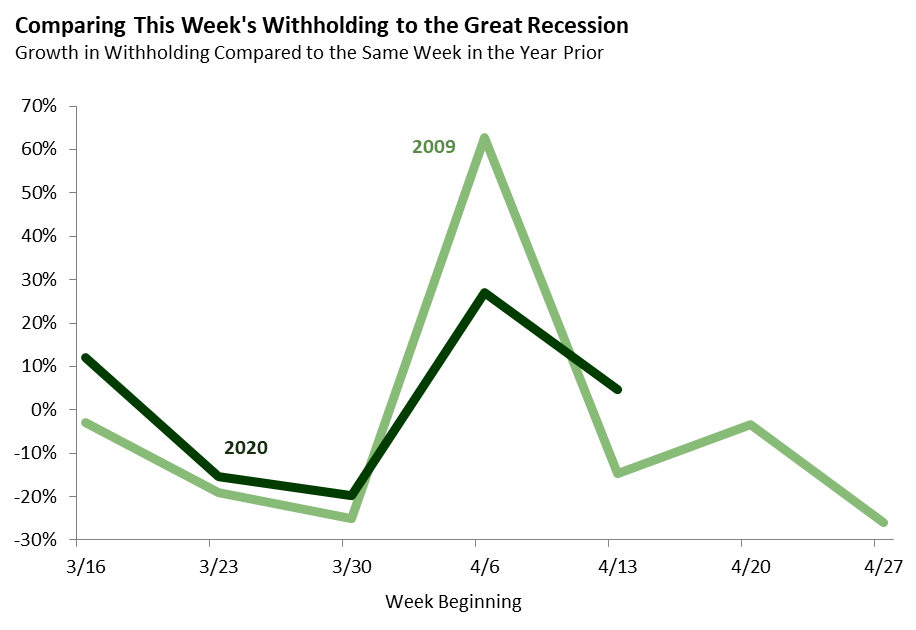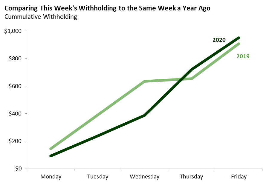 Bottom Line: Breaking with the pattern of recent weeks, this week’s withholding was slightly above the comparable week in 2019. Because weekly withholding data is noisy, it is too early to draw any conclusions from this one week reversal.