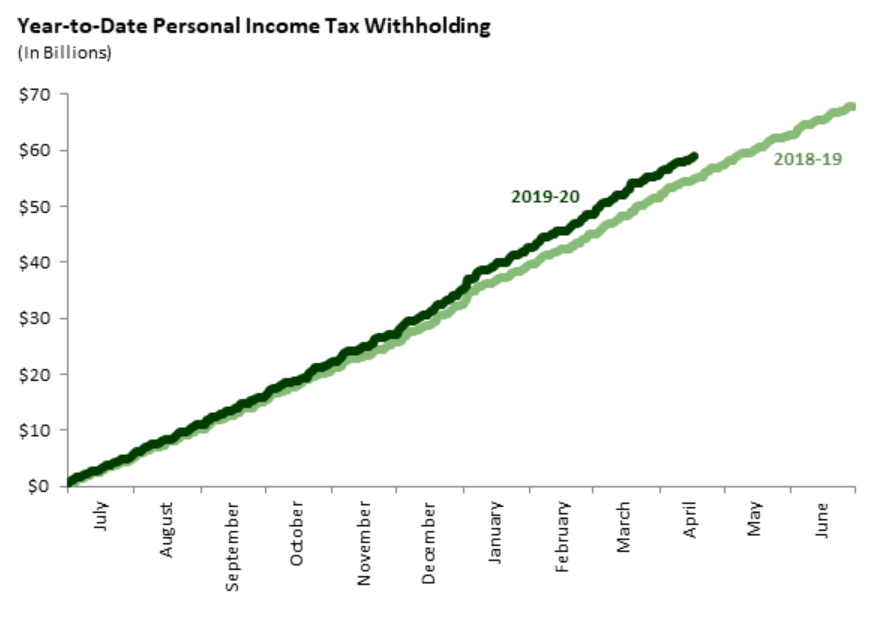 The final graph compares withholding payments so far in the 2019-20 fiscal year to 2018-19. As of now, year-to-date payments in 2019-20 remain ahead of 2018-19.