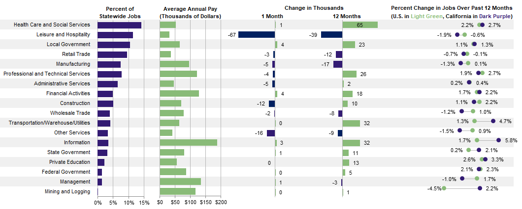 California's Employment Development Department and the U.S. Bureau of Labor Statistics released California's March 2020 state jobs report earlier this month. Statewide nonfarm employment dropped by an estimated 99,500 in March. The official unemployment rate jumped to 5.3 percent, after holding at 3.9 percent for the previous seven months. The survey reflects job losses through the second week of March, before the statewide shelter in place order took effect. California’s losses represented 14 percent of the national estimate of 701,400 jobs lost over the same period. The state has 11.5 percent of the nation’s jobs, so its losses were only slightly disproportionate.