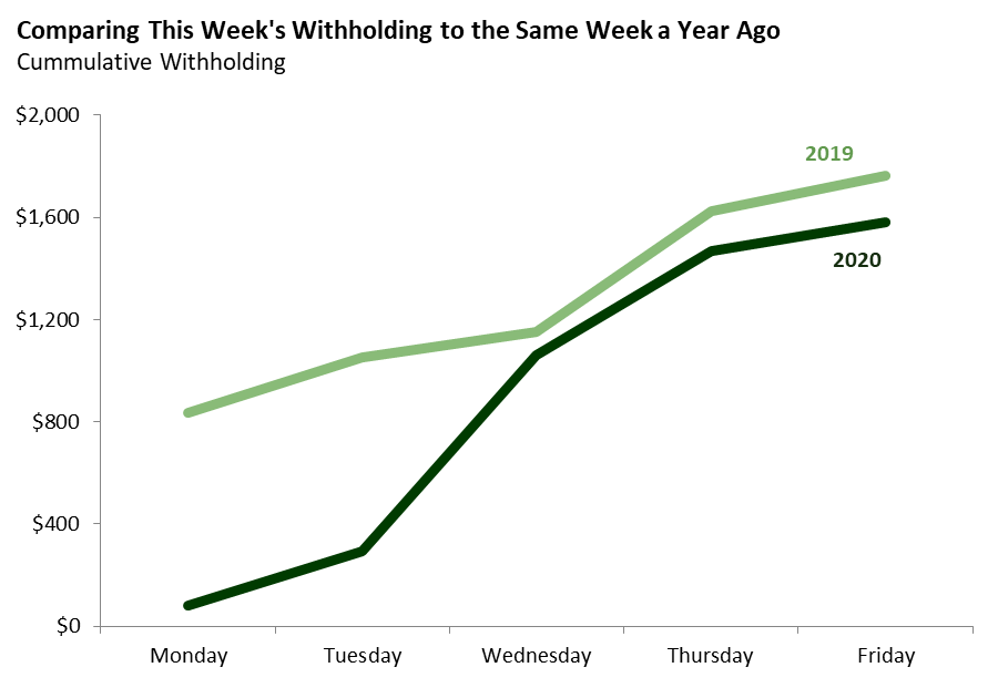 Bottom Line: Weakness in income tax withholding continued this week, with collections experiencing a slightly steeper decline than they did during the comparable week of the Great Recession.