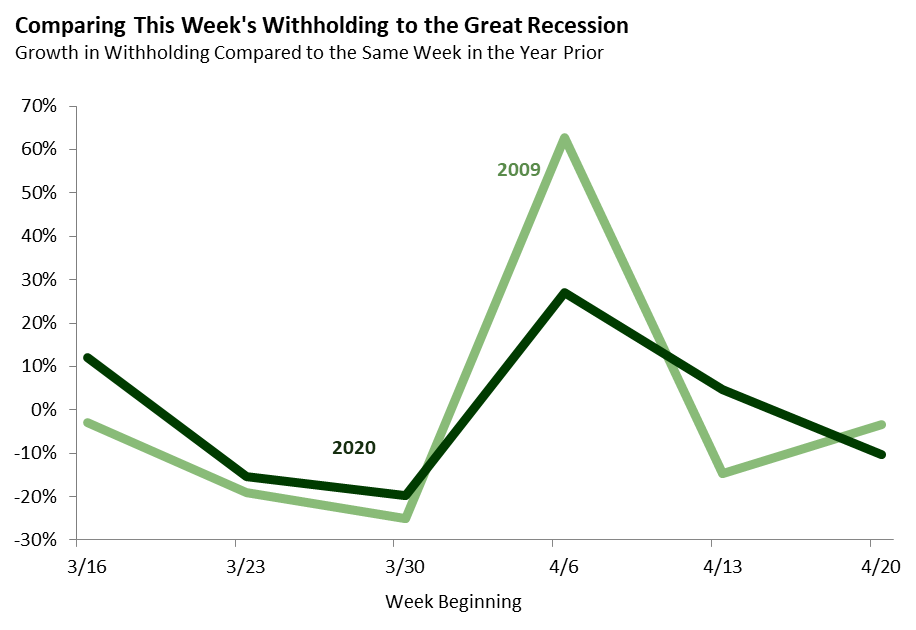 The second graph compares the year-over-year percent change in withholding (withholding this week relative to the same week in 2019) to average weekly decline experienced in March and April of 2009, when the state was in the depths of the Great Recession. The drop in withholding this week is slightly worse than the comparable week during the Great Recession.
