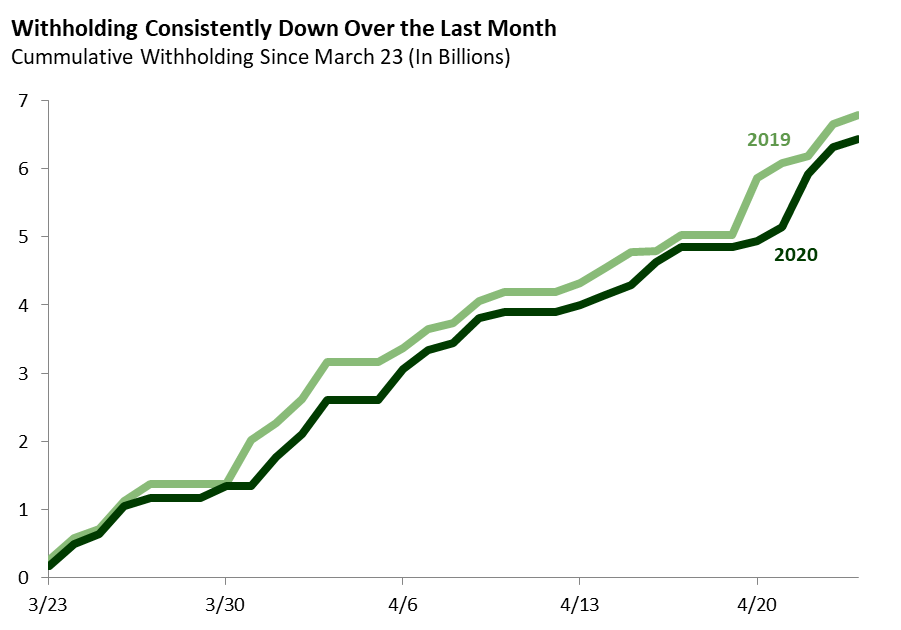 The first graph compares withholding payments received this week to payments received in the comparable week in 2019, which ran from Monday, April 22 to Friday, April 26 of that year. After a bit of a break in the recent trend last week, weakness in collections returned this week. Withholding was down 10 percent from the comparable week in 2019.