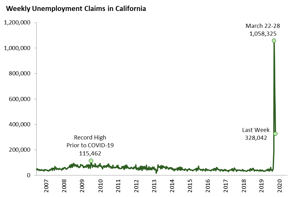 Weekly Claims Slowing Down But Remain Very High. California had 328,042 initial claims during this period. Claims have trended down consistently over the last month in after peaking at about 1 million during the week of March 22 to March 28. Nonetheless, the claims total for last week still is well above the record high prior to the COVID-19 outbreak of 115,462 in January 2010.