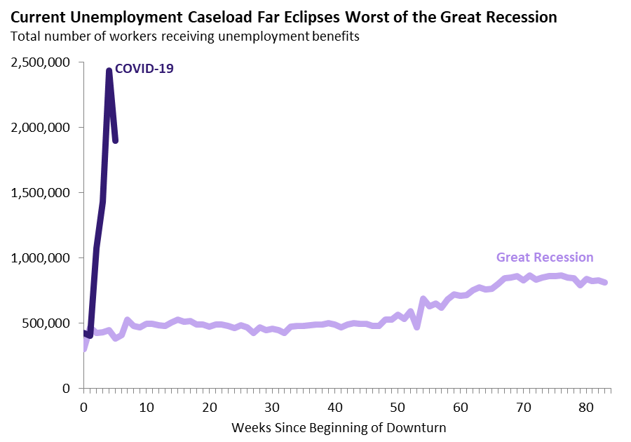 Number of Workers Receiving Benefits Actually Declined. Although initial unemployment claims remain very high, this week’s report showed a decline in the total number of workers who have been granted and are receiving benefits. About 1.9 million workers currently are receiving benefits, a decline of 527,441 from the 2.4 million workers shown in last week’s report. The reason for this drop is unclear. The drop stands in contrast to the pattern seen in the rest of the country, where the total number of workers receiving benefits grew by more than 10 percent.