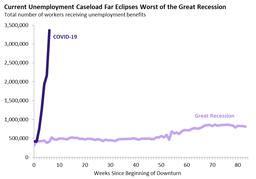 Continued Claims Well Above Great Recession Levels. The number of workers receiving benefits right now remains more than three times the highest levels seen during the Great Recession. That being said, a major factor that contributed to the severity of the Great Recession is that so many people were unemployed for such a long period of time. While the current number of unemployed workers exceeds the Great Recession, it remains to be seen how long these workers will remain without work.