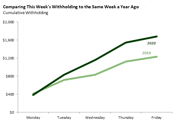 Bottom Line: Income tax withholding unexpectedly surged this week, but cumulative collections since March 23 remain somewhat below last year’s level.