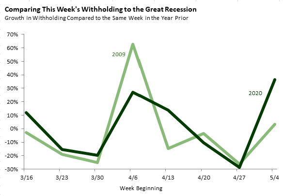 The second graph compares the year-over-year percent change in withholding (withholding this week relative to the same week in 2019) to weekly declines experienced in March, April, and May of 2009, when the state was in the depths of the Great Recession. The comparable week during the Great Recession was also a relatively good one, although it did not see the surge we saw this week.
