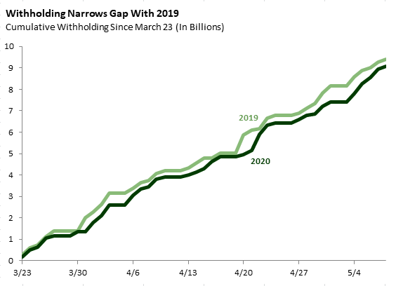 The final graph shows total withholding collections since Monday March 23, when we first started to see evidence of an impact of the pandemic on withholding. As shown in the graph, total collections between March 23 and May 8 are down 3 percent ($300 million) compared to 2019. As of last week, the gap was 9 percent ($750 million).