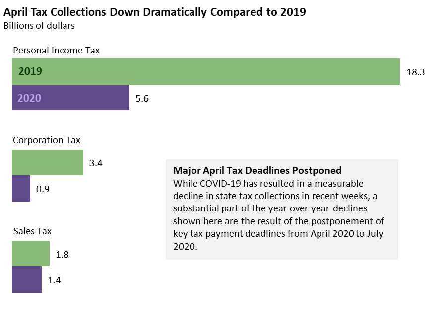 Total collections from the state’s “big three” taxes (personal income tax, corporation tax, and sales tax) were down two-thirds from April 2019. While some of this decline is due to the effect of the pandemic on the economy, it is largely driven by key tax deadlines in April being postponed until July. The components of April tax collections tied directly to these deadlines (estimated and final payments for the income tax and corporation tax) were down 85 percent, even more than overall collections.