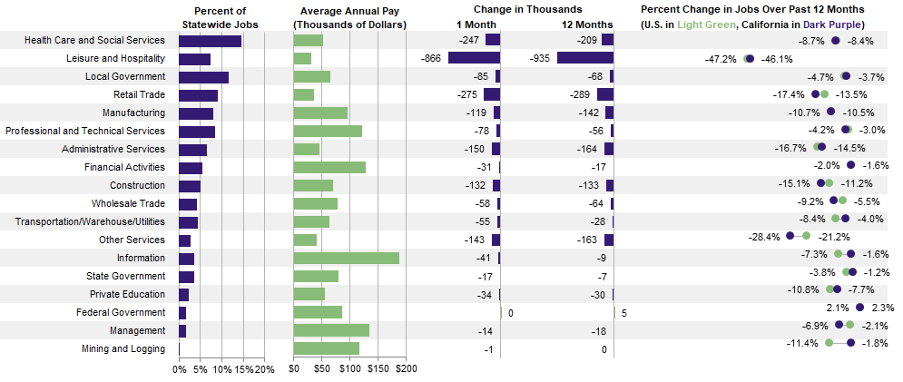 California's Employment Development Department and the U.S. Bureau of Labor Statistics released California's April 2020 state jobs report earlier this month. Statewide nonfarm employment dropped by an estimated 2,344,700 in April, and the March decline was revised upward from 99,500 to 210,500. The official unemployment rate soared to 15.5 percent, up from 5.3 percent in March and 3.9 in February. The survey reflects job losses through the second week of April, after the statewide shelter in place order had been in effect for over three weeks. California’s losses represented 11.4 percent of the national estimate of 20.5 million jobs lost over the same period, right in line with its 11.5 percent of the nation’s total payroll jobs.