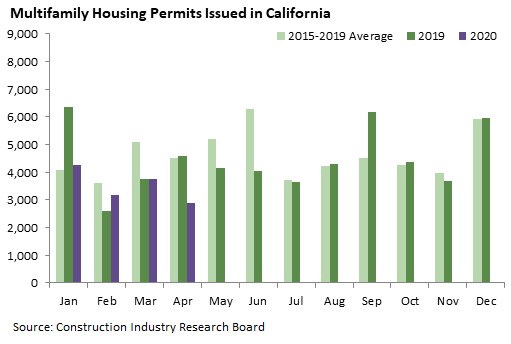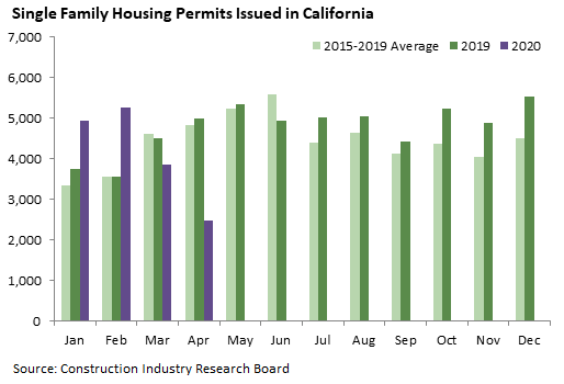 California recorded 5,383 housing permits in April, down 44 percent from April 2019. This was the lowest monthly total since January 2017, and the lowest April total since 2012. It was also nearly a third below the March total. These figures show the increasing impact of the COVID-19 pandemic and associated lockdown.