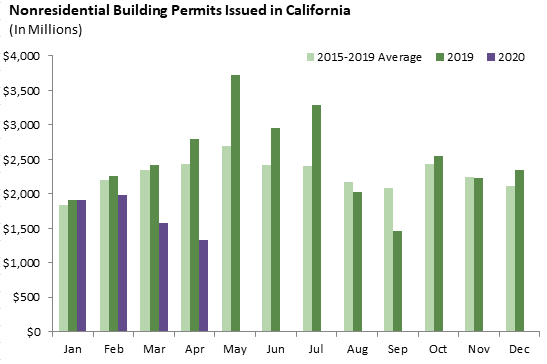 Nonresidential construction was also very weak in April. The aggregate permit value of $1.324 billion was (like the total number of single family permits) less than half the April 2019 figure, and barely half the 2015-2019 average for April. Among the categories of nonresidential construction, industrial projects had the sharpest decline. The aggregate value of $5 million was 98 percent below the April 2019 figure, and by far the lowest monthly total since at least 2012.