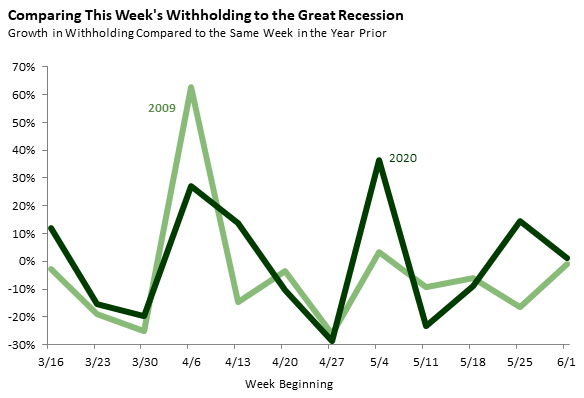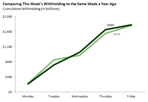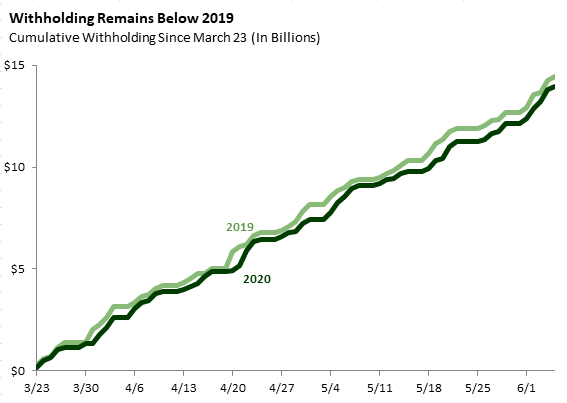 Bottom Line: Total income tax withholding since March 23 is down about 4 percent compared to last year, and this week’s collections were very close to the comparable week in 2019.