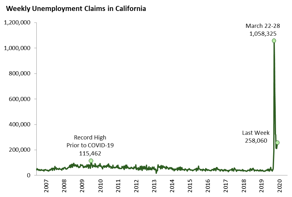 As a result of the COVID-19 pandemic, California has experienced an unprecedented rise in unemployment since the beginning of March. Through March and April, the key measure that captured the impact of the virus on the state’s workers was the number of new unemployment claims being filed each week. Going forward, this number will still be important as a gauge of whether a second wave of business closures and layoffs is emerging. Equally important to track going forward, however, will be the level of continued claims—the total number of people receiving unemployment benefits in a given week. Should continue claims start to decline, it could signal that some businesses are bringing workers back. Should continued claims keep rising, however, it could signal that the state is in for a protracted slump.