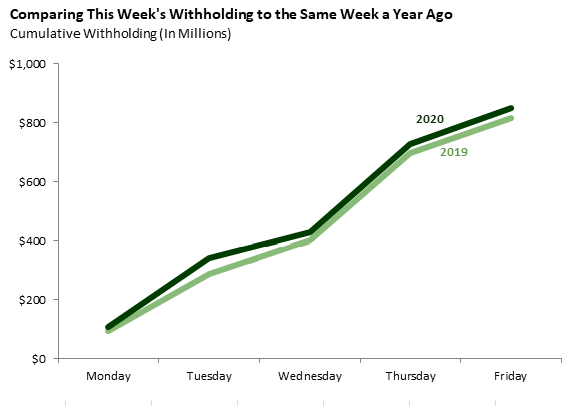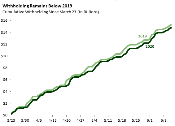 Bottom Line: There has been a notable improvement in income tax withholding recently, with collections in each of the last three weeks coming in ahead of the comparable weeks in 2019.