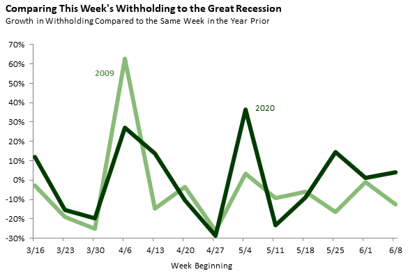 The second graph compares the year-over-year percent change in withholding (withholding this week relative to the same week in 2019) to the weekly changes observed from March through June of 2009, when the state was in the depths of the Great Recession. The comparable week during the Great Recession showed a 12 percent decline from the same week in 2008.