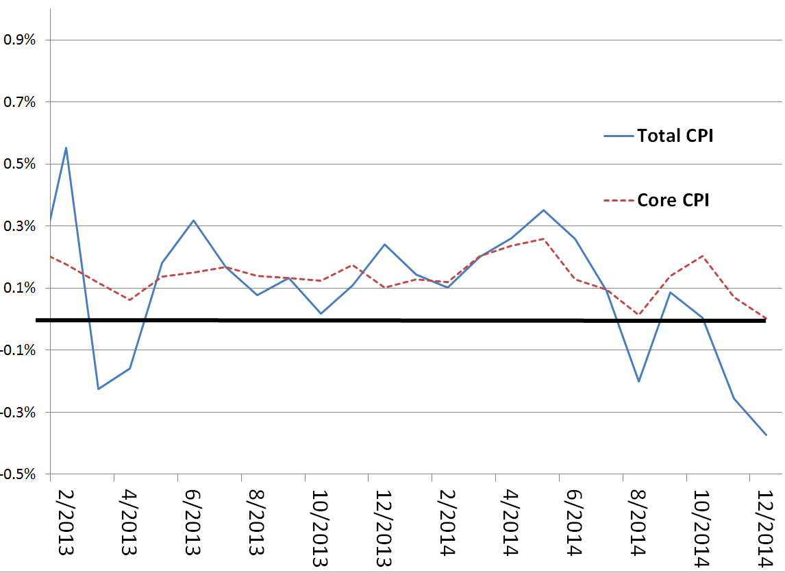Total CPI Down in December. The overall (total) CPI measure, the CPI for all urban consumers, declined 0.4 percent in December on a seasonally-adjusted basis. Total CPI previously fell in August and November. (The figure below displays the month-by-month changes in total CPI and "core" CPI, described further below, since the beginning of 2013.) For 2014 as a whole, today's data indicates that total CPI rose 0.8 percent after a 1.5 percent increase in 2013. According to BLS, CPI growth since last year represents "the second smallest December-to-December increase in the last 50 years, trailing only the 0.1 percent increase in 2008." Over the last 10 years, the average increase was 2.1 percent.