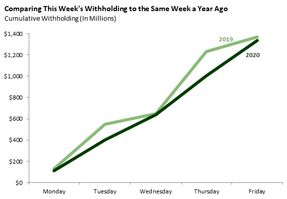 The first graph compares withholding payments received this week to payments received in the comparable week in 2019, which ran from Monday, June 17 to Friday, June 21 of that year. Withholding was down 2 percent from the comparable week in 2019. The daily collection pattern was much smoother than in 2019.