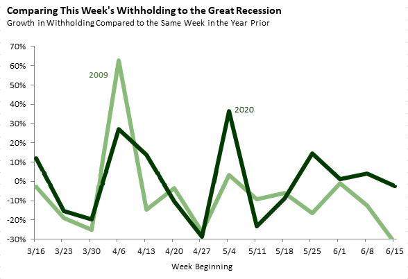 The second graph compares the year-over-year percent change in withholding (withholding this week relative to the same week in 2019) to the weekly changes observed from March through June of 2009, when the state was in the depths of the Great Recession. The comparable week during the Great Recession showed a 32 percent decline from the same week in 2008. It appears that withholding has bottomed out much earlier in the cycle than it did in 2009.