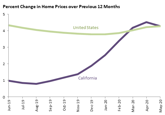 May 2020 data indicate that the typical home in both California and the nation at large has appreciated 4.3 percent since May 2019. Home prices in California were nearly flat for much of 2018 and 2019, but picked up at the end of 2019 and surpassed the national growth rate in March.