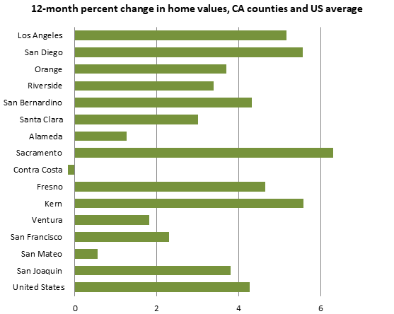 The graph below shows appreciation over the past 12 months for the state’s 15 largest counties. The San Francisco Bay Area has some of the most expensive housing in the nation, but the five Bay Area counties among this group (Alameda, Contra Costa, San Francisco, San Mateo, and Santa Clara) have all seen recent appreciation below the national average rate and Contra Costa has in fact seen a decline.