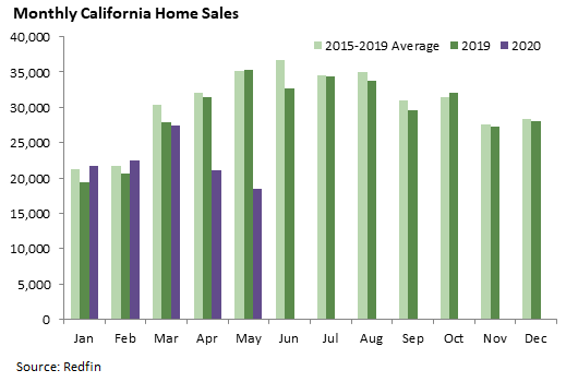 Home sales can be a good indicator of the health of the state’s economy and housing markets. California home sales were running at a relatively high level earlier in the year, but have dropped sharply as a result of the COVID-19 pandemic. The slump deepened in May, as the state recorded barely half as many sales as in May 2019. The graph below shows unadjusted home sale counts according to Redfin, a national real estate brokerage.