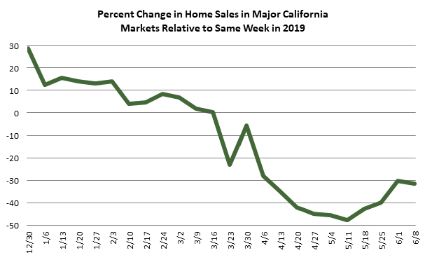 This next graph compares each week in 2020 to the comparable week in 2019 using Redfin data for California’s twelve largest markets. The graph suggests that home sales bottomed out in the middle of May and have since recovered somewhat but remain severely depressed.