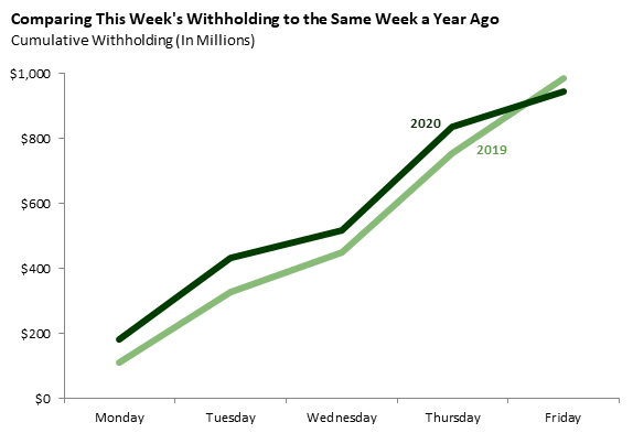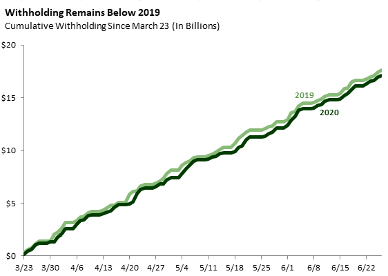 The first graph compares withholding payments received this week to payments received in the comparable week in 2019, which ran from Monday, June 24 to Friday, June 28 of that year. Withholding was down 4 percent from the comparable week in 2019. Monday and Tuesday were higher than in 2019, but the rest of the week was lower.
