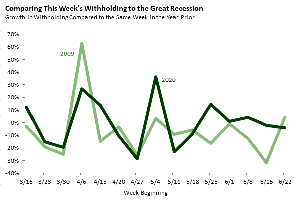 The second graph compares the year-over-year percent change in withholding (withholding this week relative to the same week in 2019) to the weekly changes observed from March through June of 2009, when the state was in the depths of the Great Recession. The comparable week during the Great Recession showed a 4 percent increase from the same week in 2008. This was a change from the recent pattern of smaller year-over-year withholding declines than in 2009.