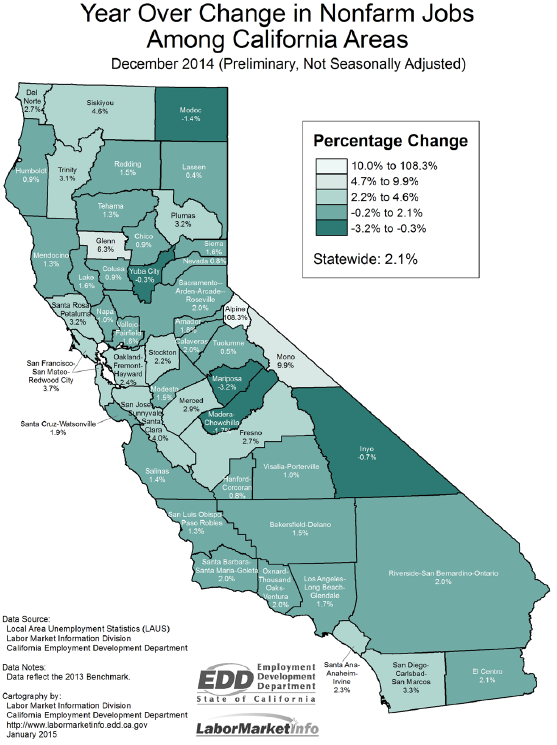Regional Trends. According to the non-seasonally-adjusted EDD map below, California's regional nonfarm job gains over the past year were led by strong performance in the Bay Area , San Diego, and parts of the Central Valley. The rate of job gains in Los Angeles County, while positive, lagged the state as a whole in 2014. The rate of job growth in Orange County was just above the state average in 2014, while the Inland Empire and the Sacramento region lagged a bit.