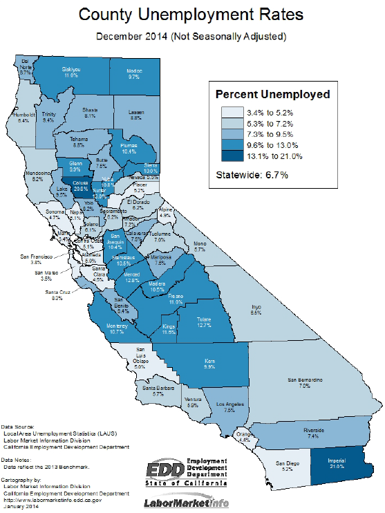 There is, however, substantial variation in unemployment levels across the state, ranging from below 4 percent in parts of the Bay Area to about 21 percent in Imperial and Colusa Counties. (A direct link to a clearer version of the EDD maps below is here.)