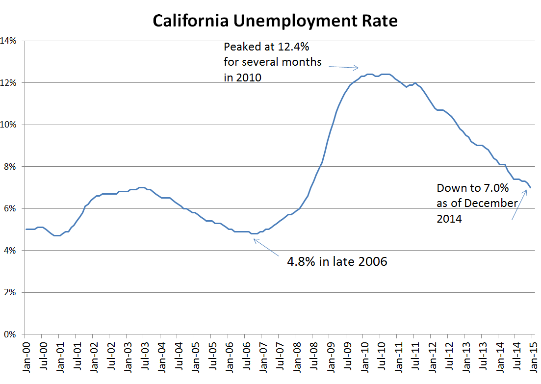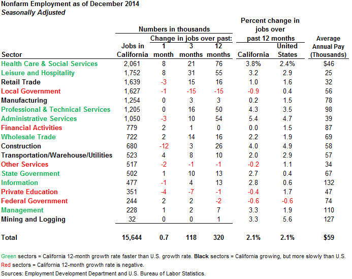 The state's Employment Development Department (EDD) released its initial report, to be revised later, on December 2014 employment in California. The headline unemployment rate in the state dropped to 7.0 percent in December, down from 7.2 percent one month before. The initial seasonally-adjusted job growth number for November 2014 (a blockbuster number of 90,100) was revised downward to a still very strong 82,800. The initial data in today's report showed that December 2014 seasonally-adjusted job growth for the entire state numbered just 700, which indicates a muted end to a strong year for California. From December 2013 to December 2014, nonfarm employment in the state grew by 320,300 (up 2.1 percent), with solid growth averaging nearly 27,000 jobs per month. This figure indicates California's economy is solidly in expansion mode.