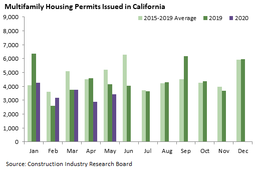 The multifamily housing permit total of 3,429 was not far below the May 2019 figure, but it was well below the May average over the previous five years. March and April were similarly below their 2015-2019 averages.