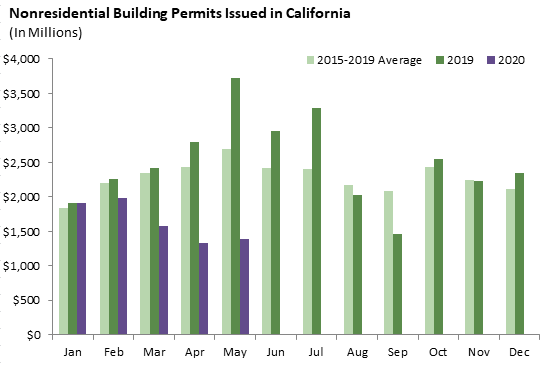Nonresidential construction permit activity remained very weak in May. The aggregate permit value of $1.384 billion was more than 60 percent below the May 2019 figure, and barely half the 2015-2019 average for May. Among the categories of nonresidential construction, the aggregate value of $359 million for new commercial projects was the lowest monthly total since 2013.