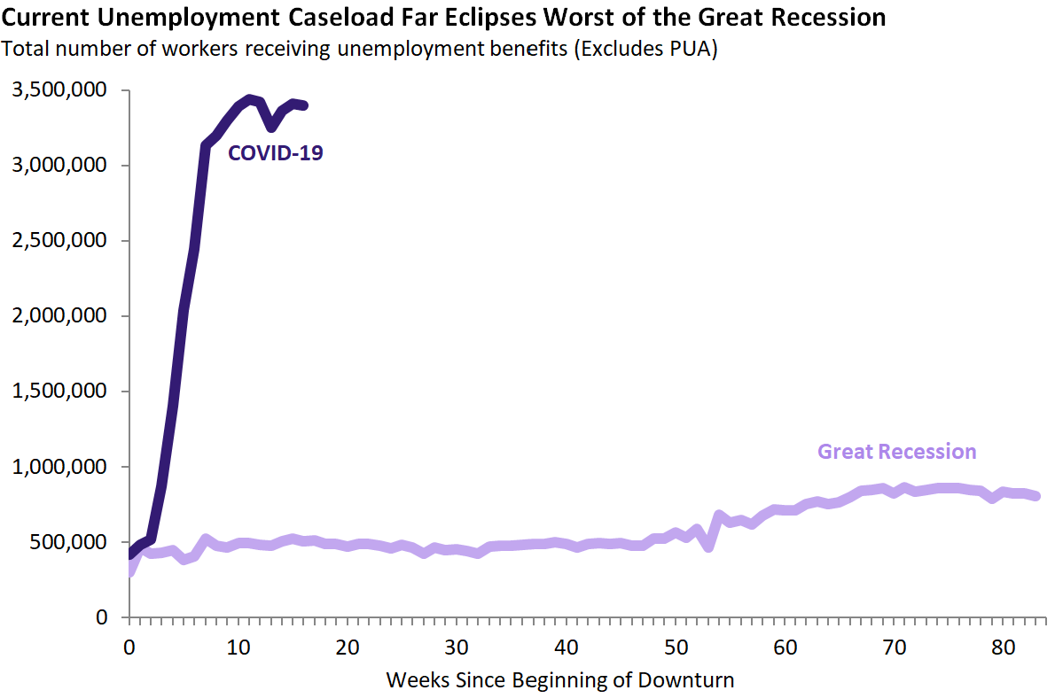 Continued Claims Remain Near Their COVID-19 Peak. As of July 4, California had about 4.2 million workers receiving unemployment benefits. This includes about 3.4 million receiving traditional unemployment benefits and about 800,000 receiving Pandemic Unemployment Assistance—a new program created to expand eligibility for unemployment insurance to self-employed workers and others not typically eligible for the traditional program. For the past several weeks, continued traditional unemployment claims have remained steady near their peak COVID-19 level. For the sake of accurate historical comparison, the graph below shows only the traditional unemployment claims.