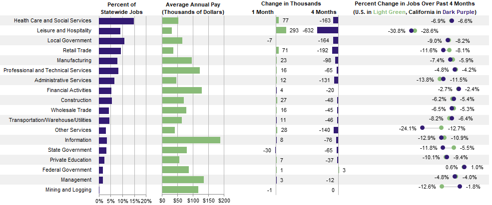 California's Employment Development Department and the U.S. Bureau of Labor Statistics released California's June 2020 state jobs report today. Statewide nonfarm employment rose by an estimated 558,200 in June, and the May increase was revised downward from 141,600 to 134,200. The official unemployment rate was 14.9 percent, down from 16.4 percent in April and May but far above the estimate of 3.9 in February before the COVID-19 pandemic caused large-scale upheavals. The survey reflects job changes through the week of June 7 to June 13, after the state had been largely reopened but before the recent sharp increases in statewide case counts. California accounted for 11.6 percent of the national estimate of 4.8 million net jobs gained in June, in line with its 11.5 percent of the nation’s total payroll jobs as of February.
