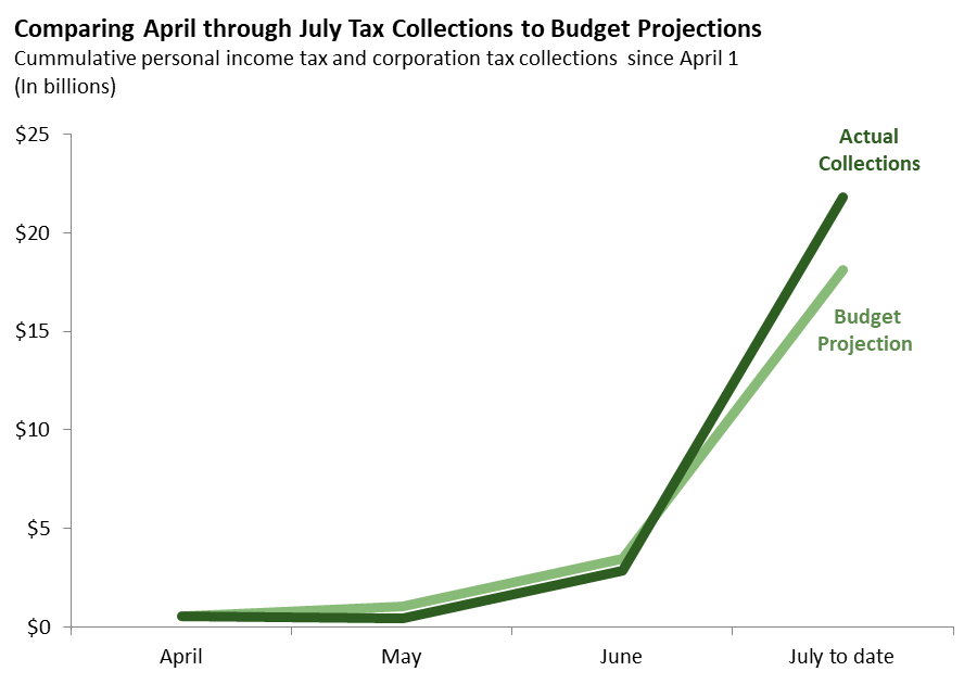 In a normal year, April and June are key months for state personal income tax and corporation tax collections, while July is relatively uneventful. This year, however, deadlines for tax payments typically due in April and June were moved to July. These deadline shifts make this July a critical month. In this post, we report on preliminary data on July collections. We will post updates on July 24 and July 31.