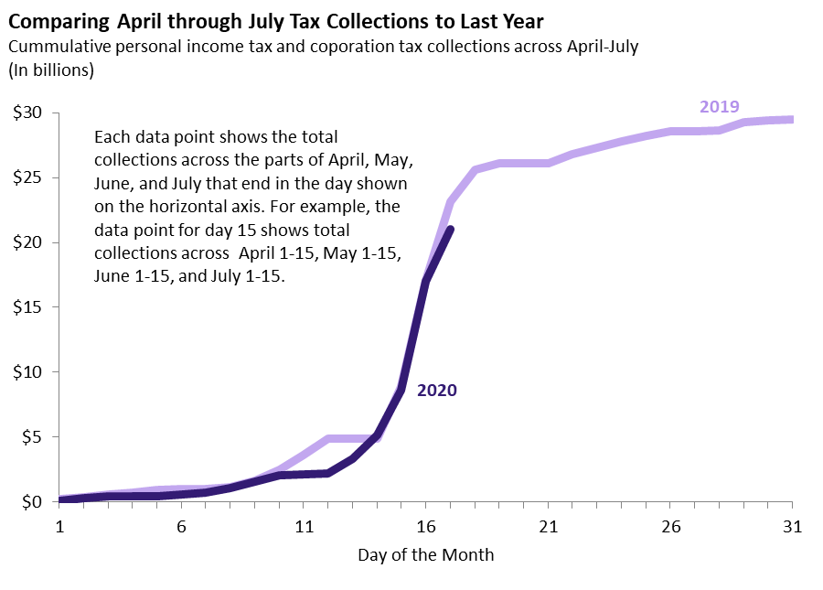 In the second graph, we compare the daily collections pattern in 2020 to 2019. Specifically, for each day of the month, the graph shows the total collections across the parts of April, May, June, and July that end in that day. For example, for day 15, the graph shows total collections across April 1-15, May 1-15, June 1-15, and July 1-15. As the graph shows, collections thus far in 2020 generally have tracked closely with 2019. As of the 17th, however, 2020 collections are about 9 percent ($2 billion) behind the 2019 pace.
