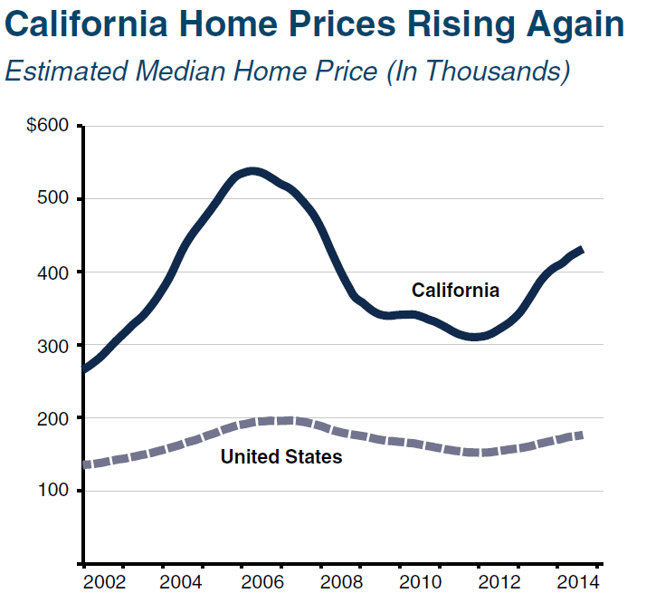 • Strong Gains Continued Into 2014. The median home price has continued to rise in recent months, with Zillow’s estimated median home price in California reaching $432,800 in October 2014. This was roughly the same as it was ten years ago in 2004.
