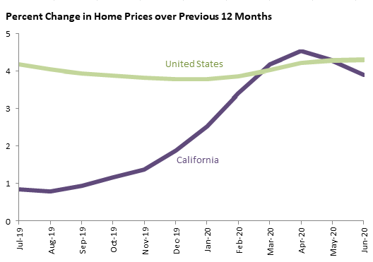 June 2020 data suggest that home price growth has slowed in California but not nationwide. The typical home in California has appreciated 3.9 percent since June 2019, while the national figure is 4.3 percent. As recently as April, the state’s home price growth outpaced the nation’s.