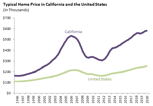 Home prices are important to the California economy for a number of reasons. In the short and medium terms, home price increases often drive construction activity, which in turn spurs employment growth in a wide range of sectors. In the longer term, chronically high housing costs have hurt the state’s business climate and been a key reason California loses residents to other states on net in most years.