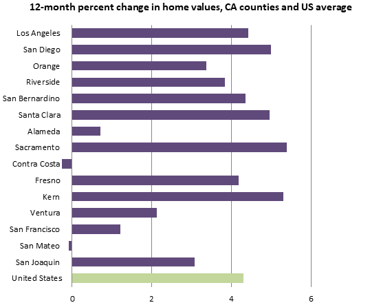 The graph below shows appreciation over the past 12 months for the state’s 15 largest counties. The four central San Francisco Bay Area counties (Alameda, Contra Costa, San Francisco, and San Mateo) have seen little or no home price growth over the past 12 months, although this has not been the case in neighboring and equally expensive Santa Clara.
