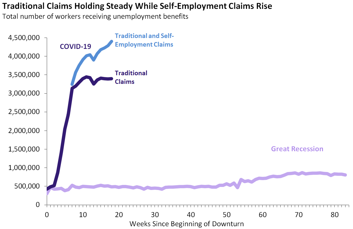 Self-Employment Claims Rising, Exceed 1 Million for the First Time. Between July 12 and July 18, California had 1 million self-employed workers receiving unemployment benefits under Pandemic Unemployment Assistance—a new program created to expand eligibility for unemployment insurance to self-employed workers. While the number of traditional unemployment claims has remained steady over the past month, the number of self-employed workers receiving benefits has increased by about 50 percent. (The graph below shows both traditional and self-employment claims. The most accurate historical comparison is between the Great Recession and COVID-19 traditional claims, as self-employment unemployment claims were not available during the Great Recession.)