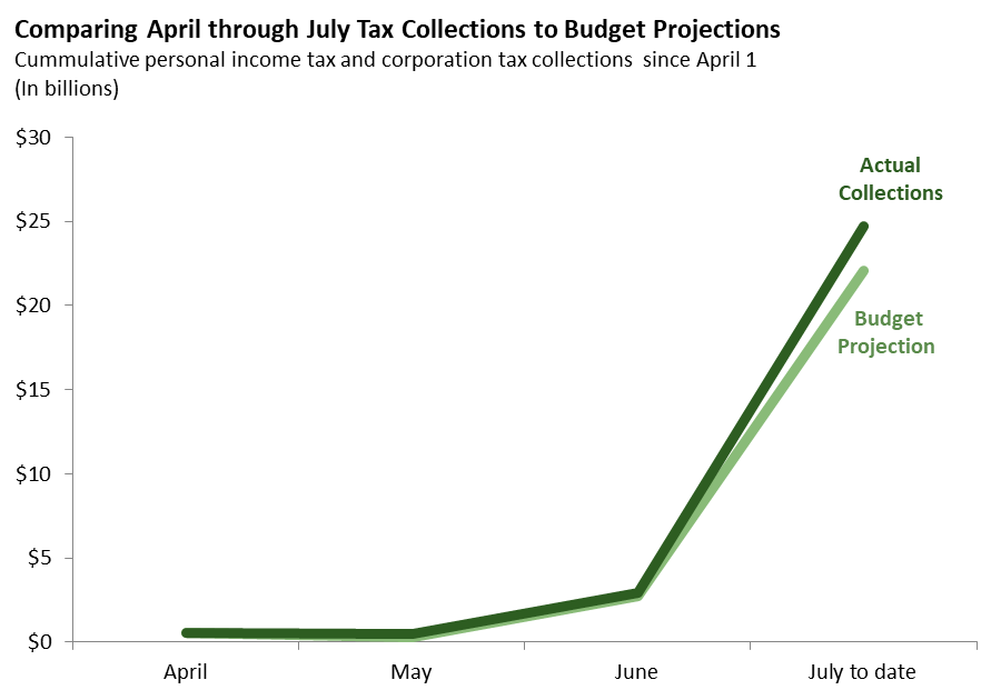 In a normal year, April and June are key months for state personal income tax and corporation tax collections, while July is relatively uneventful. This year, however, deadlines for tax payments typically due in April and June were moved to July. These deadline shifts make this July a critical month. In this post, we report on preliminary data on July collections.