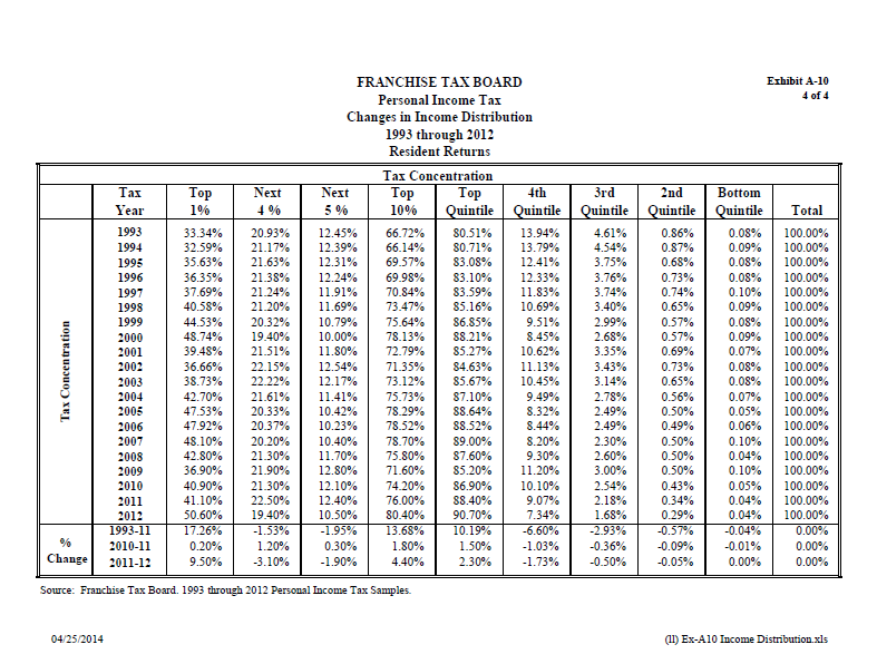 FTB's May 2014 revenue estimating exhibits contain information on the share of the state's PIT paid by the top 1% of PIT filers (see Exhibit A-10, Page 4 of 4, in the May exhibits, as excerpted below).