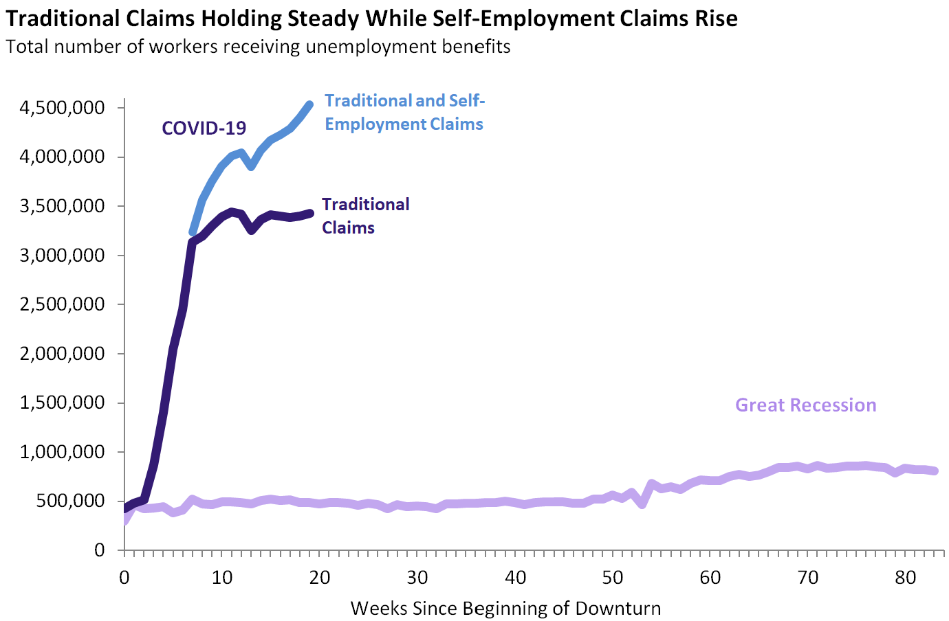Self-Employment Claims Jump by More Than 100,000. Between July 19 and July 25, California had 1.1 million self-employed workers receiving unemployment benefits under Pandemic Unemployment Assistance—a new program created to expand eligibility for unemployment insurance to self-employed workers. The number of self-employed workers receiving benefits jumped by more than 100,000 from the prior week. While the number of traditional unemployment claims has remained steady over the past month or so, the number of self-employed workers receiving these federally funded benefits has increased by more than 50 percent. (The graoh below shows both traditional and self-employment claims. The most accurate comparison is between the Great Recession and COVID-19 traditional claims, as self-employed unemployment benefits were not available during the Great Recession.)