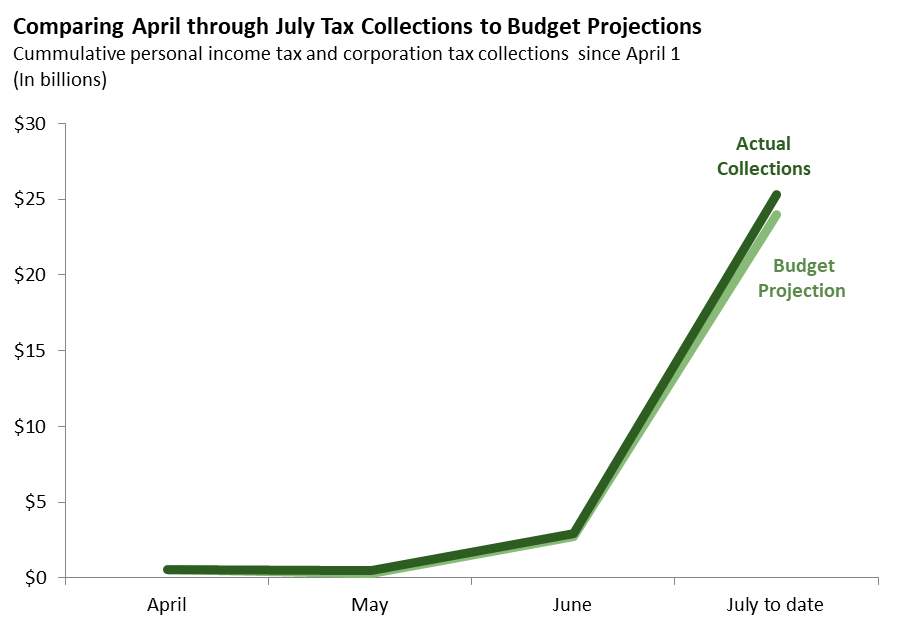 In a normal year, April and June are key months for state personal income tax and corporation tax collections, while July is relatively uneventful. This year, however, deadlines for tax payments typically due in April and June were moved to July. These deadline shifts make this July a critical month. In this post, we report on preliminary data on July collections. An important note: normal tax collection operations were interrupted for multiple days this week. The impact of these interruptions on preliminary collections data is not yet clear.