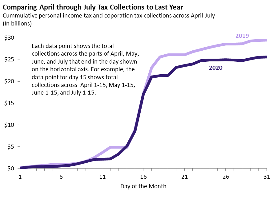 In the second graph, we compare the daily collections pattern in 2020 to 2019. Specifically, for each day of the month, the graph shows the total collections across the parts of April, May, June, and July that end in that day. For example, for day 15, the graph shows total collections across April 1-15, May 1-15, June 1-15, and July 1-15. As of the 31st, 2020 collections are about 13 percent ($4 billion) behind the 2019 pace.