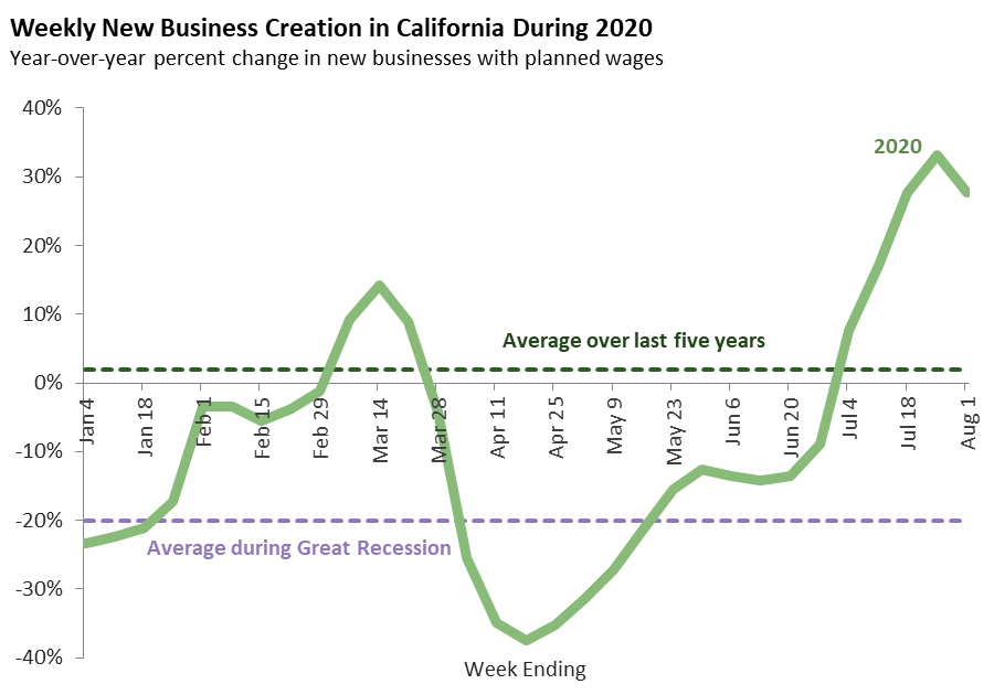 The graph below shows weekly data on business creation in California from the U.S. Census. New business creation crashed in late March and remained depressed through June. Over the last month, however, business creation has picked up notably, growing much faster than the recent historical average. This trend is somewhat surprising, and perhaps heartening, given that public health restrictions related to COVID-19 generally were being tightened during this period.
