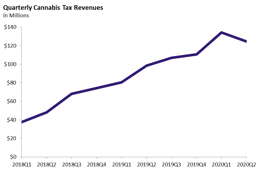 Fourth Quarter of 2019-20: $125 Million. The administration currently estimates that retail excise tax revenue was $102 million and cultivation tax revenue was $23 million in the fourth quarter of 2019-20 (April through June).